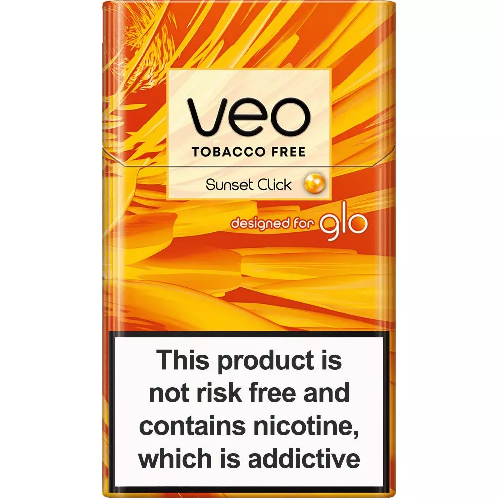 Tobacco free. Veo Sunset Click has a tropical fruits flavor with a capsule that reveals more intense and fresh pineapple aroma. For use only with Glo Hyper line of devices.